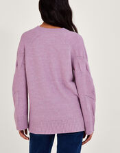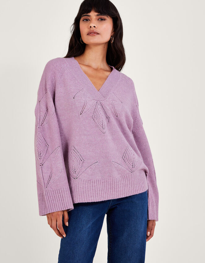Summer's over. Admit defeat and slip this jumper on for day-to-day layering. Designed with a v-neck and wide sleeves, it features a lilac knit blend with pointelle stitching and ribbed trims. Purple