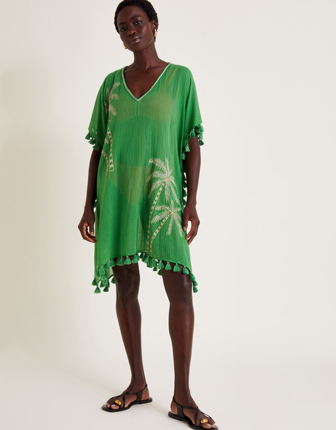 Destination dressing. Adorned with golden palms and tassel trim, this lighter-than-air cotton kaftan features a relaxed V-neck and a mini-length hem. A timeless suitcase staple to effortlessly slip on over swimwear. Green