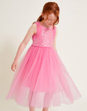 Do you believe in magic? Party ready, this sage green dress is designed with a sequin-clad, sleeveless bodice with pretty ruffle detailing. Finished with a maxi length tulle lined skirt to show off their sparkly shoes. Pink