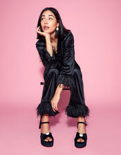 Feather trim: In. Designed in soft black velvet, these trousers feature a slightly flared leg and glamorous feather trim that falls just above the ankle. Timelessly chic. Black