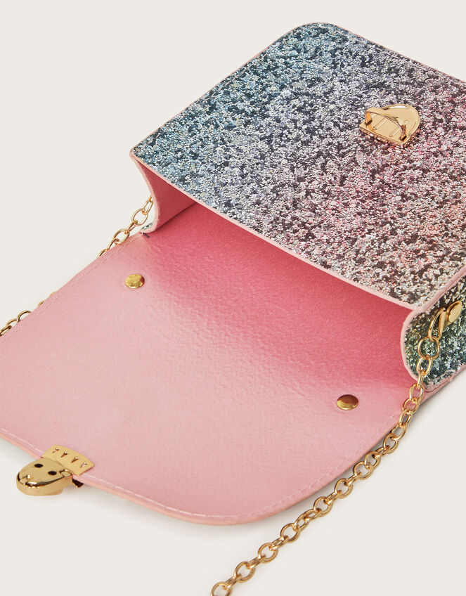 It's so sparkly! Coated in a rainbow of glitter, this satchel bag will house their sweets, lip balm, and toy phone. Fastens with a fold-over, push lock, and chain strap to wear across the body or over the shoulder.