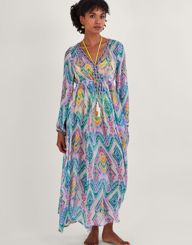 Hotel breakfast before the beach? Simply slip into this kaftan before the morning sun breaks through. It's finished in a bohemian-style ikat print and embroidered trims to the neckline, with a drawstring waist that'll keep your shape as you stroll from the hotel, to the beach, to the bar! Pink