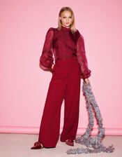Power move. For serious business, slip into these trousers for days in the office. Sitting high on the waist, they fall into a wide leg fit with sleek satin stripe detailing to the sides to elongate the leg. Wit-woo. Red