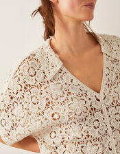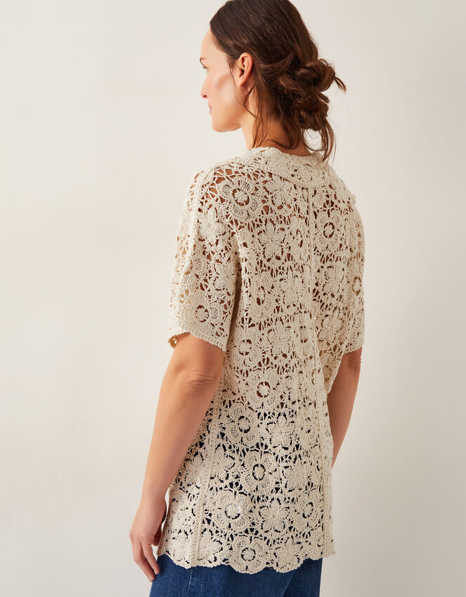 Crochet time, baby. Slouchy and summer-ready, this crochet blouse is cut with a collared neckline, v-front and scalloped hem that falls past the hips. Ivory