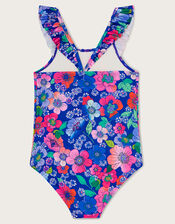 Bold florals bloom over the blue backdrop on this swimsuit, making it their new favourite for weekend swimming lessons. Designed in stretchy swim fabric, it features shoulder straps with frilly detailing, designed in stretchy swim fabric. Blue