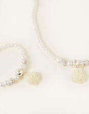 They'll love decorating their party dresses with these pretty pearls! Crafted out of pearlised beads and rosy charms, this duo includes a necklace and matching bracelet.