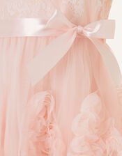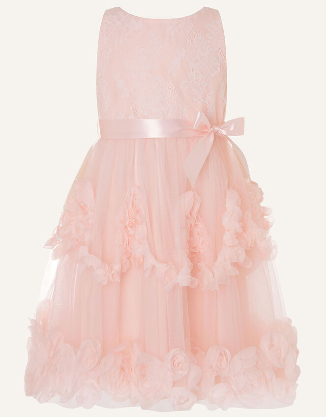She'll look the sweetest at her next event in this elegant occasion dress. It's created with floral lace, layered tulle and 3D rose details, with a glossy ribbon tie for around her waist.  Pink