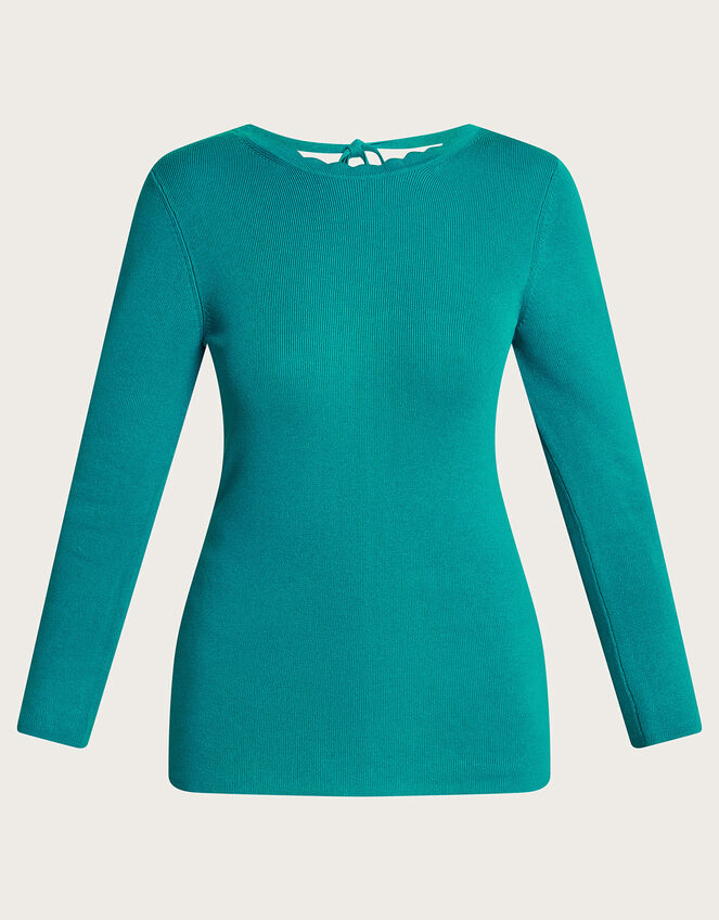 A simple piece with just a touch of fun, this jumper features a scallop neckline with tie detailing that hangs down the back beautifully. It's an ideal everyday piece, perfect for the office, the pub, and the weekends! Teal