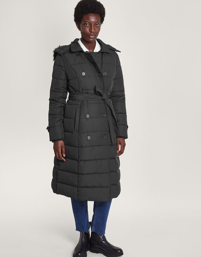 For venturing out into wintery showers or for just feeling cosy on the morning dog walk, slip our Roxy coat on to dodge the cold. Designed with recycled polyester, her long length hems at the knee with a hood, belted waistline and padded finish that builds the silhouette. Complete with double breasted buttons and pockets.