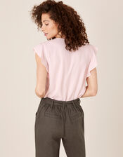 Breathe classic femininity into your smarter looks with this short-sleeved blouse. Perfect for your 9-5, this design features a V-neckline, ruffled armholes and fabric-covered buttons through the front. Pink