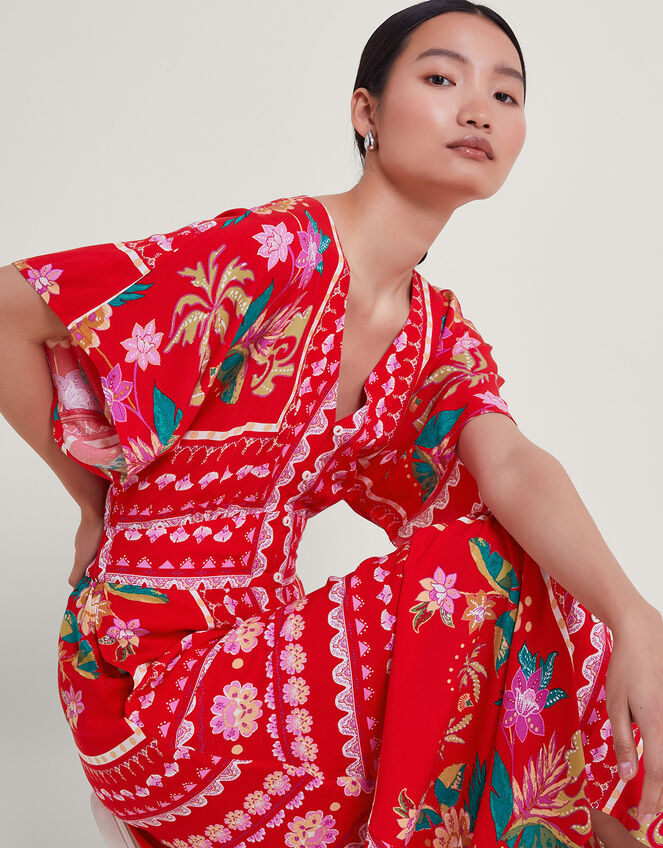 The dress worthy of summer solstice. Fitting and flaring in all the right places, this piece combines angel sleeves with a slim-fitting waist and floaty, maxi skirt. Cast in a colourful print and finished with a button-through front. Red