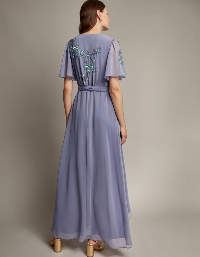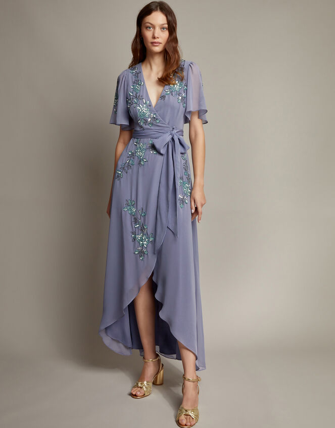 RSVP-ready sway, right this way. Timelessly elegant with a sprinkle of sparkle, this dress is primed for any special occasion. The wrap silhouette compliments the V-neckline and tulip-style hem, whilst the floaty short sleeves and shimmery floral embellishments exude femininity.