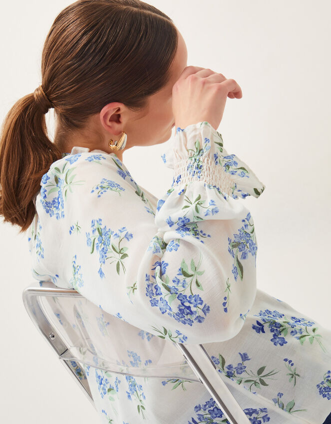 A sheer delight. Framed with flouncy sleeves and a frilly V-neckline, this blouse is patterned with blue flowers you'd pick from a springtime garden. Add a feminine touch to your looks and pair with wide leg trousers or your fave denim. Ivory