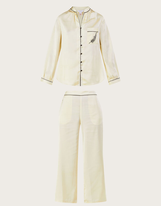 Winter nights have never been cosier than in this pyjama set. Spun in soft satin, this set features a shirt and bottoms combination, with black piping and an embroidered feather design to the front pocket.