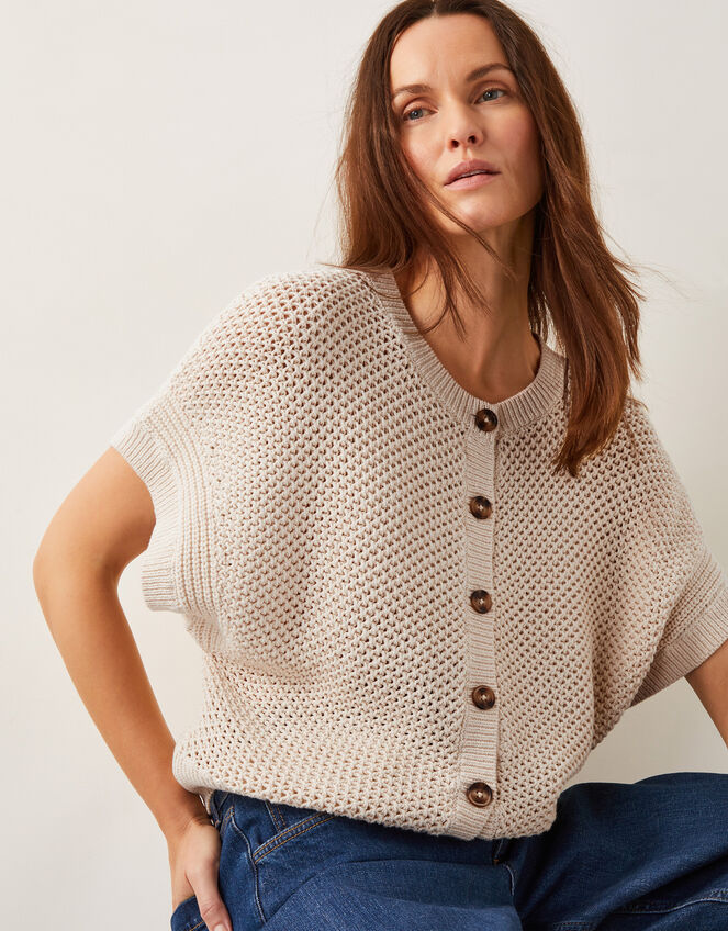Knitwear all-year-round. Giving layers for days, this cardigan boasts a crochet finish in a relaxed, short-sleeve profile. Fastening through the front with buttons, layer it over a long sleeve tee for the chillier months, or wear it alone for the warmer seasons. Ivory