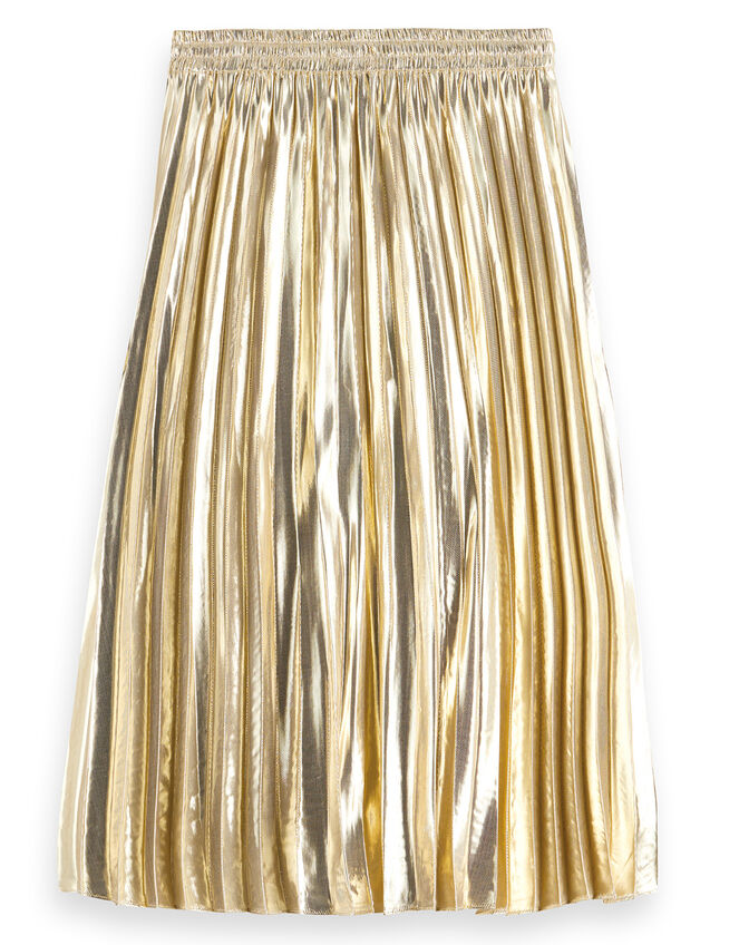 The product: Reflect sunrays in this skirt. Featuring a pleated silhouette with a high-shine finish, this piece sits high on the waist with a tie. Best paired with tucked-in tees and casual camis.