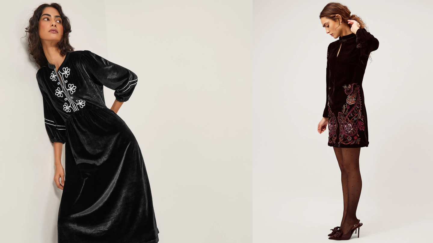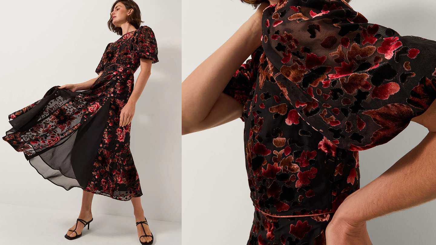 For dinner parties, velvet midi dresses are the perfect smart-casual choice. Look out for velvet devore styles, which featuring burnt-out velvet patterns, they feel less formal than a full velvet dress but give a perfect nod to the trend.
