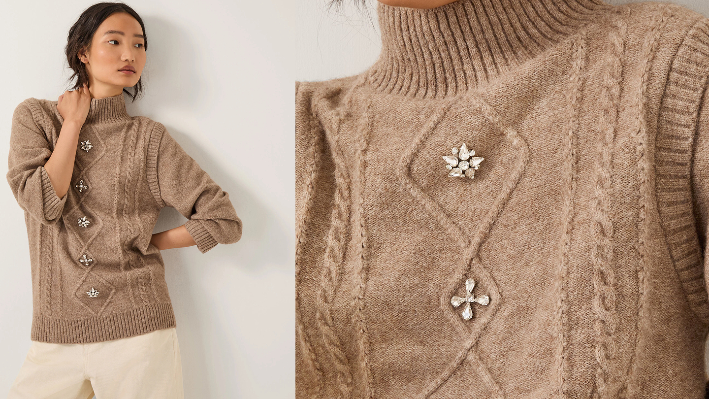 Looking for a traditional women’s Christmas jumper? A cable knit sweater will always stand the test of time. 80s, preppy and practically perfect in every way – there’s nothing I’d rather wear on Christmas Day. For a When Harry Met Sally look, opt for the chunkiest cable knit you can find (preferably a roll neck). But if your vibe is more Cameron Diaz in The Holiday, reach for a sandy soft neutral with elegant embellishments, luxe lounge pants, a hat and a scarf for full cosy factor.