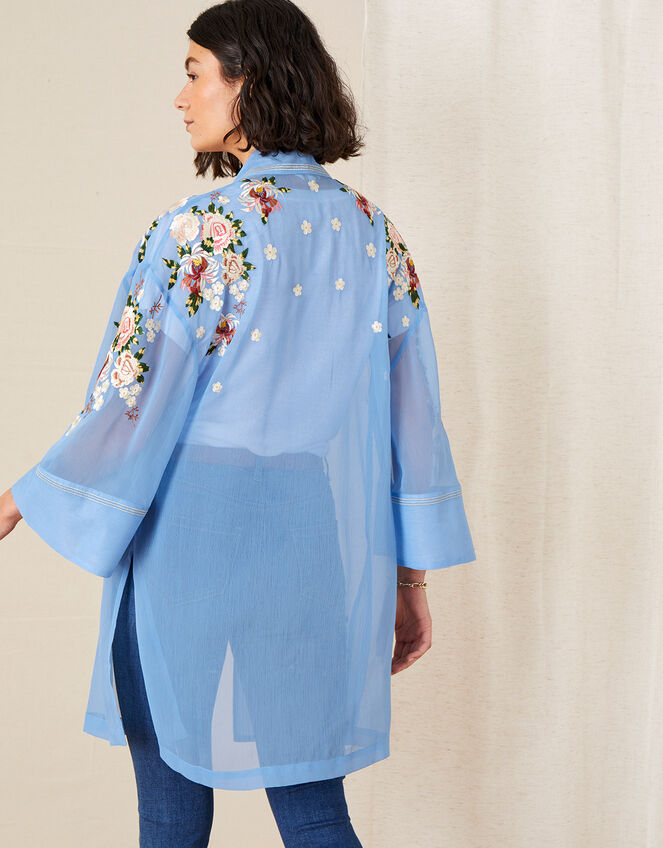Ideal during warmer months, this longline kimono is a sheer topper to any outfit. It features floral embroidery to the shoulders, an open front and wide, relaxed sleeves. Blue