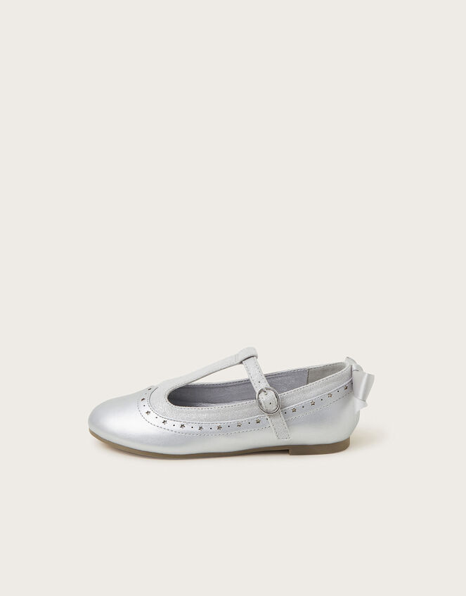 Party shoes, with extra security. They'll be dancing, twirling, and toe-tapping the night away in these shoes, designed in a brogue-inspired profile. The T-bar fastening on the upper makes for an extra snug fit, with a shimmery silver finish and satin bow detailing on the heel. Silver