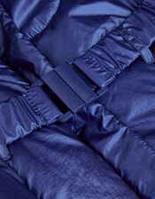 Emulating the midnight sky, this padded coat is designed in shimmery cobalt blue fabric. It features ruffles through the skirt and a belted waist, with detachable faux fur. Finished with a fleece lining.