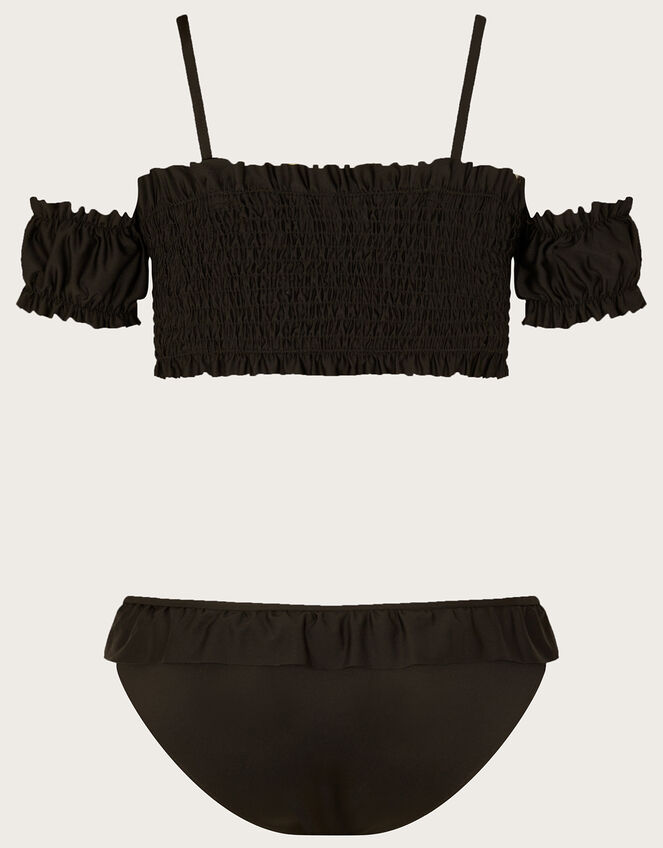 For seasonal splashes in the sea and all-year-round pool days, this bikini will have them excited to practice their mermaid moves. Designed in black fabric, it features stretchy shirring through the top with cold-shoulder sleeves. The matching bottoms include a comfortable brief cut before finishing with a layered frill to the waistband.
