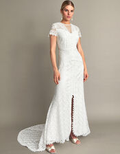 Back to not-so-basics. Intricate lace is greeted by delicate spotted mesh on this bridal gown. Find sheer lace that grazes the shoulders into short, capped sleeves, continuing through into a slim fitted bodice. Complete with a front slit through the skirt, the lace extends through the back of the dress into a short train.
