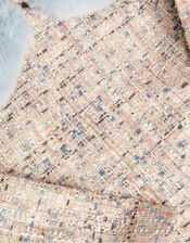 This isn't any regular tweed... Woven with metallic fabric, it'll sparkle under December sun with a detachable faux fur collar that matches icy school runs. Built with a skirted hem and structured shoulders, it fastens with poppers for easy dressing. Blue
