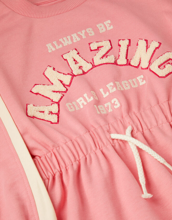Sporty Spice. Taking elements of a sweatshirt for a comfy daytime style, this varsity-inspired dress features a textured embroidered design on the front that reads 'ALWAYS BE AMAZING'. Complete with a stretchy drawstring waist and a stripe down the sleeves. Pink