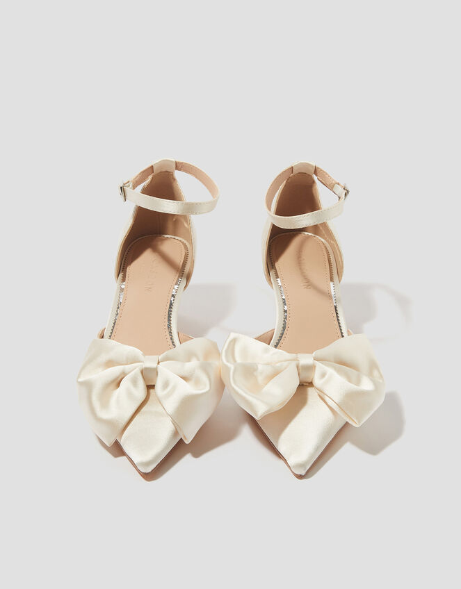 The bow trend: wedding edition. Designed with a pointed toe and topped with a satin bow, these strappy heels make the perfect pedestal for your bridal look. Fastens around the ankle with a buckled strap. Ivory