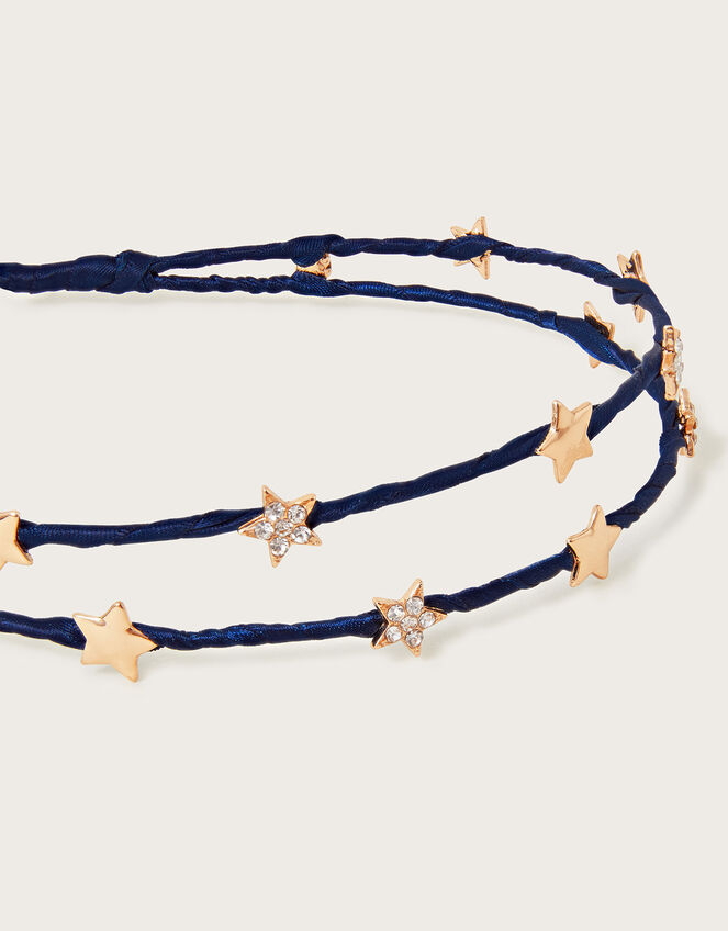 Embellished with gold, sparkling stars, this headband features a double wire design. It's wrapped in navy ribbon to emulate the midnight sky, with diamantes throughout for extra sparkle.