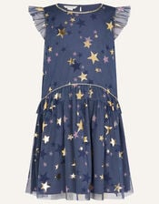 Loose fitting and airy, this dress is perfect for your little one to run around in at parties. Decorated with a shining star print and finished with frilly detail on the shoulders and waistline.