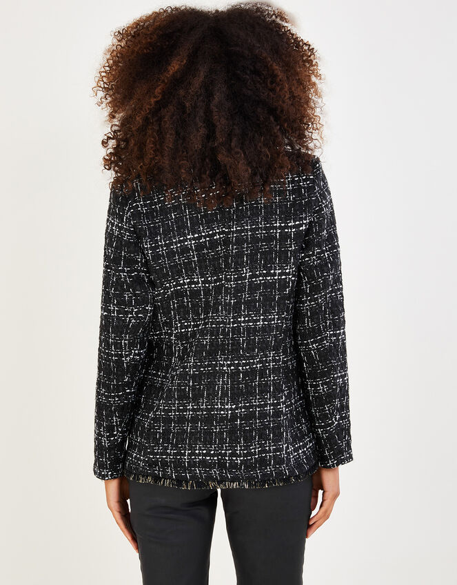 True shabby chic: infuse texture into every office outfit with our Tammy top layer. Her structured silhouette is built with tailored shoulders, lapels and a button through front, with fringe detailing for effect. Black