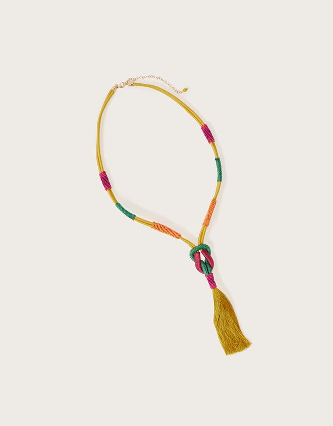 Fabricated with woven cotton rope, this necklace features a yellow base, with contrast detailing throughout into the knot centre piece. Hanging from the piece is a fuchsia tassel pendant, encapsulating a bohemian atmosphere for summer.