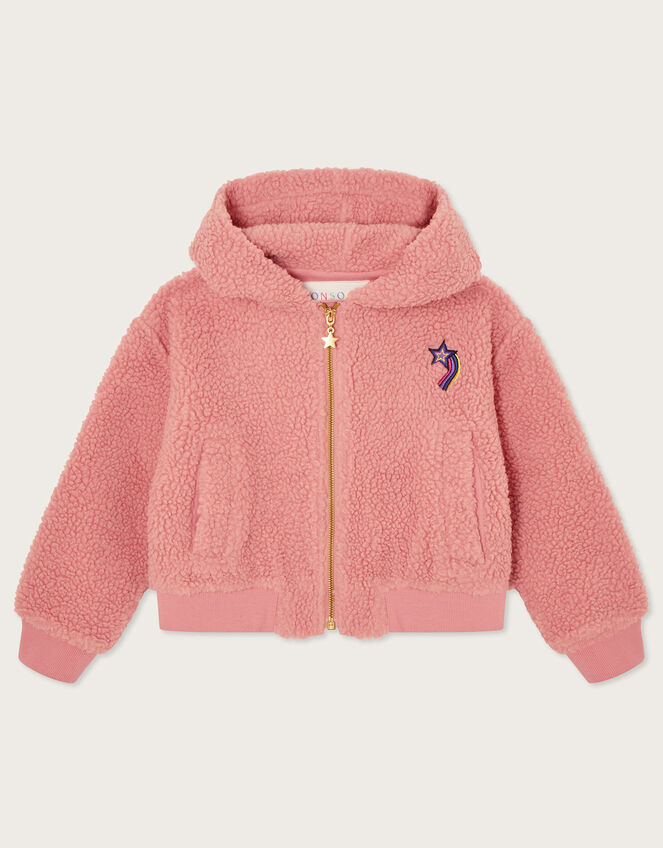 This versatile fleet jacket is designed with a super soft teddy fabrication. It features a hood, pockets, a ribbed hem and cuffs and zip closure. To the front is an embroidered shooting star, with a matching star pull tab.