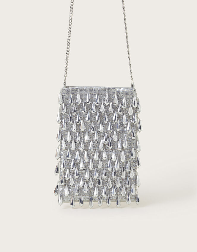 Our favourite plus one. Embellished with teardrop gems and sparkling sequins through the front, this phone bag present a party-ready finish. Fastening with a magnetic snap closure, it sits across the body with a chain strap.