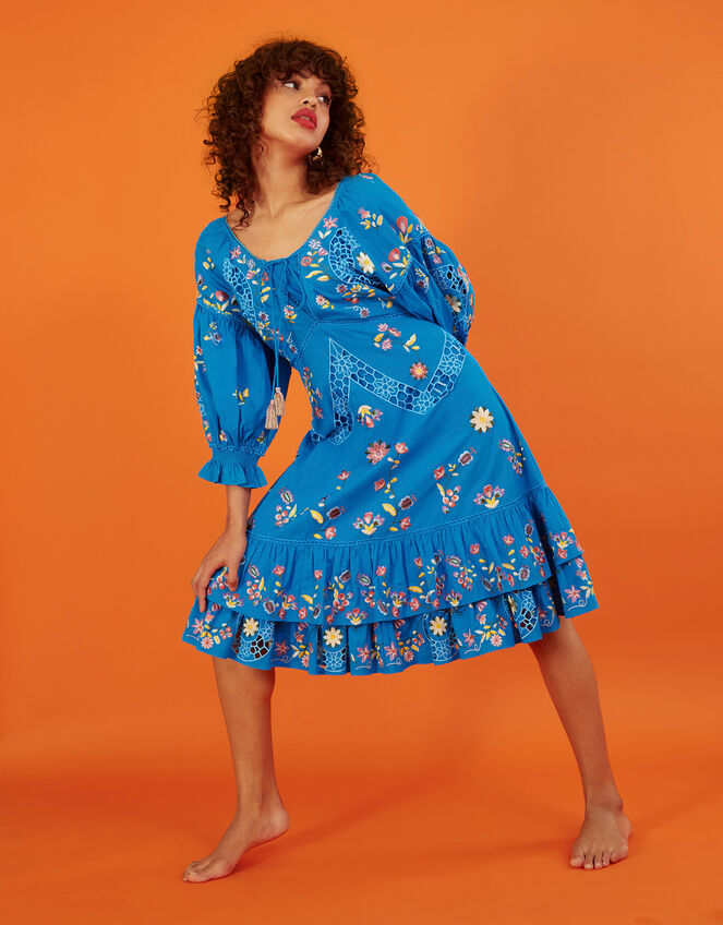 Bright and beautiful, this dress is head-to-toe embroidered and ready to party alfresco style. The floral embroidery runs through the piece, with geometric patterning through the skirt and bodice. The puff sleeves add a feminine flair, whilst the v-neckline fastening with tassel detailing that transcends into the tiered flared skirt.