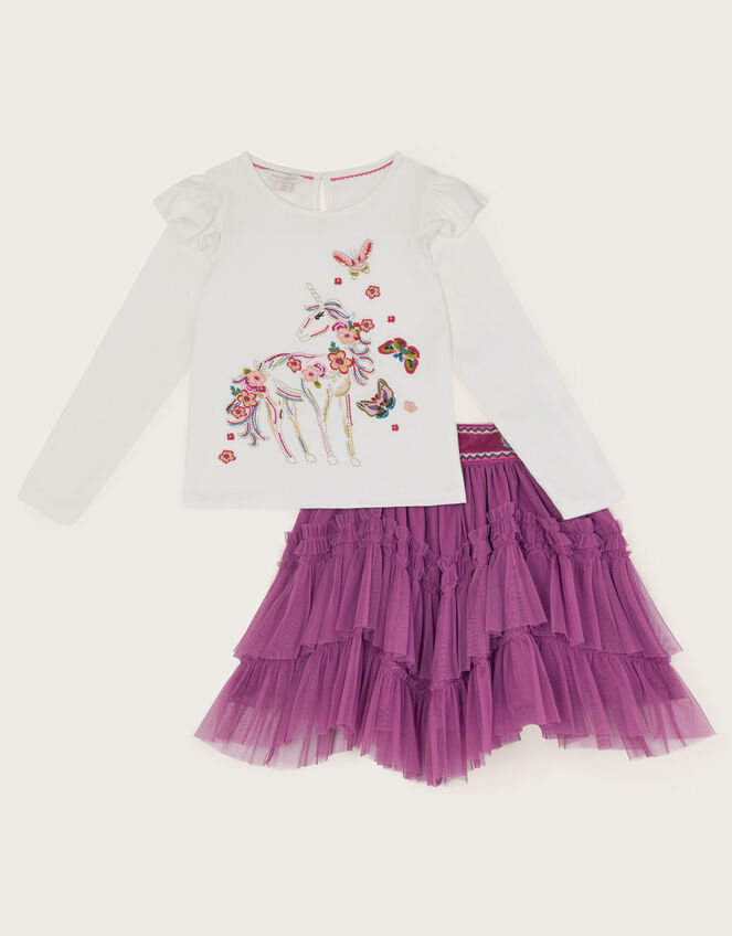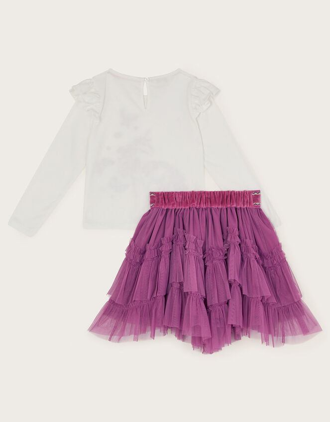 D-I-S-C-O. Embroidered with a beautiful floral unicorn to the ruffle detail long sleeve t-shirt, this set is finished with a layered tulle rara skirt and handkerchief hemline. Purple