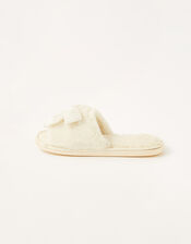 Fluffy feet: choose these faux fur sliders for stay-at-home style. Designed for the glamorous lounger, they feature a pretty velvet bow. Ivory
