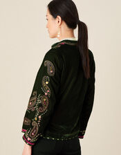 Designed to slip perfectly into your workwear edit, this piece is engineered from luxurious velvet with paisley print embroidery. Includes long sleeves, a high neck and open style front. Green