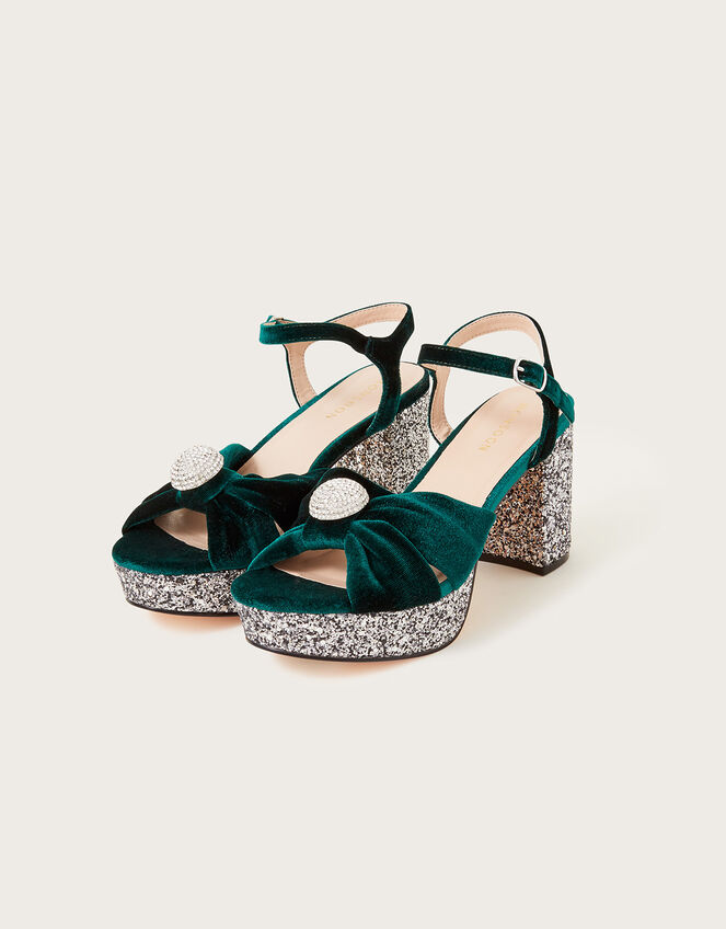 Don't just attend the party, bring the party with these shoes. Featuring all things glamour, they boast a glittery overlay to the heel and chunky platform. The upper is designed in luxe velvet, with a diamante embellished applique to the toes. Green