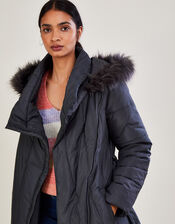 Festive markets or chilly weekend walks, where will you style Vera? Her neutral charcoal hue makes her easy to throw over any outfit, finished with an asymmetrical zip. Stay cosy with the fluffy hood and high neck, with a mid length that works to keep your legs warm.