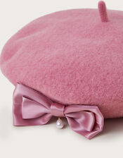 Treat the walk to school like a catwalk. Made in super-soft wool, this beret is designed with a sleek, satin bow to the front with a teeny tiny pearl charm. Paris, here we come! Pink