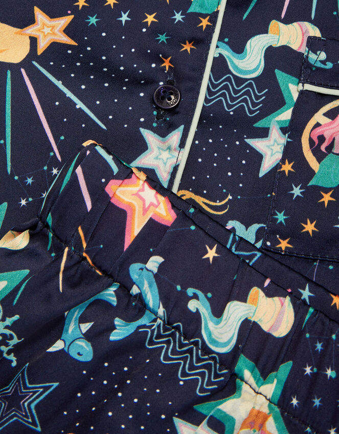 Dreamland: Incoming. Designed in soft satin, this adorable pyjama set is comprised of a button-through shirt and matching bottoms. Finished with an all-over zodiac print, can you find yours? Blue